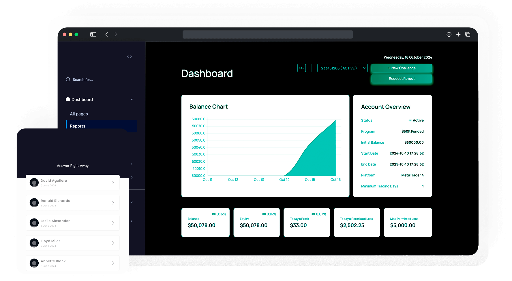 Our team is available via live chat to assist you with challenges, funded accounts, and payouts.